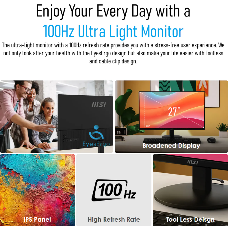 - MSI EyesErgo Tech: Combines TÜV-certified Anti-Flicker, Less Blue Light, Anti-Glare coating, and Eye-Q Check software for healthier, prolonged viewing.